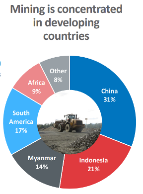 85% se ga pridela na Kitajskem, Indoneziji, Myanmaru, Peruju, Braziliji, Boliviji in v Kongu: