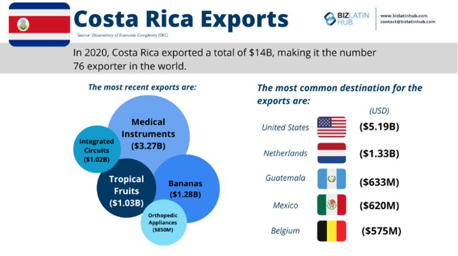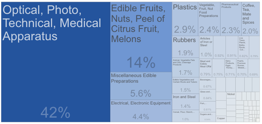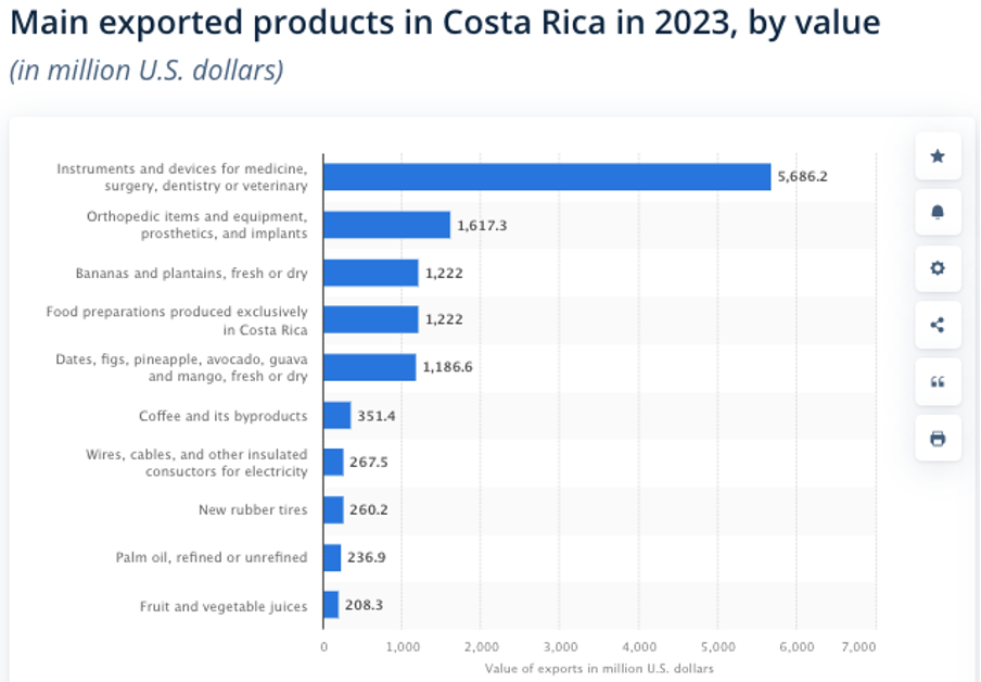 Izvoz niso samo osnovne stvari, kot v Nici, npr. banane, ampak dodelani value-add proizvodi (od medicinskih do polprevodnikov):