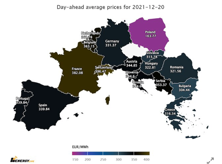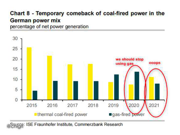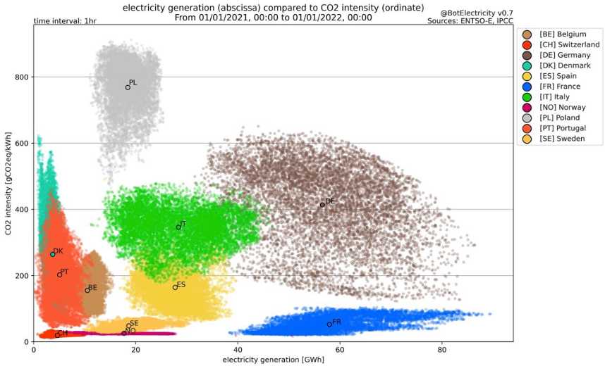Nemška najčistejša obdobja generacije elektrike so bila bolj "umazana" od katerega koli obdobja v Franciji na primer. Najbolj ogljično intenzivno obdobje v Nemčiji je bilo 6.5x bolj intenzivno od tistega v Franciji. Na poljskem so bolj ogljično "umazani", ampak so vsaj najcenejši.