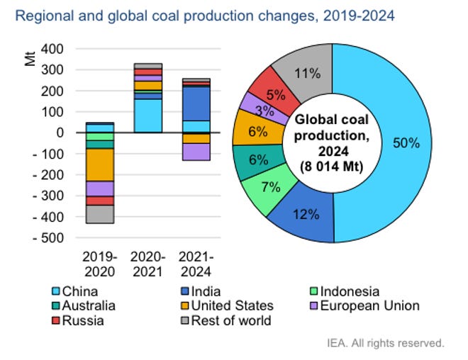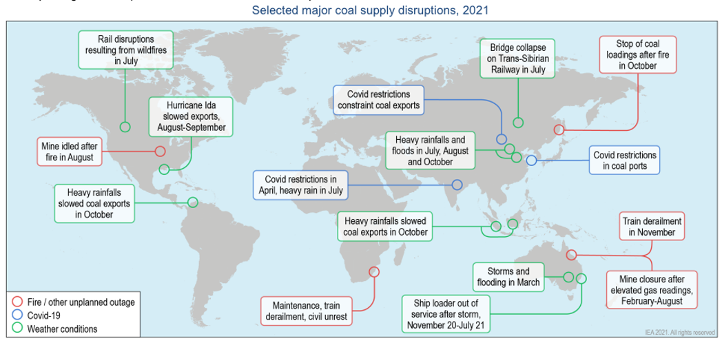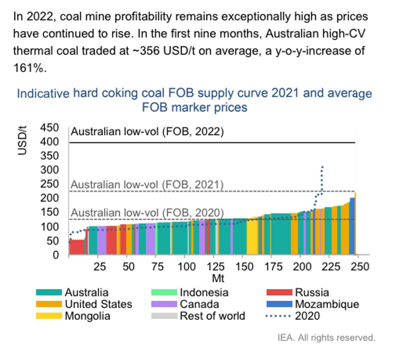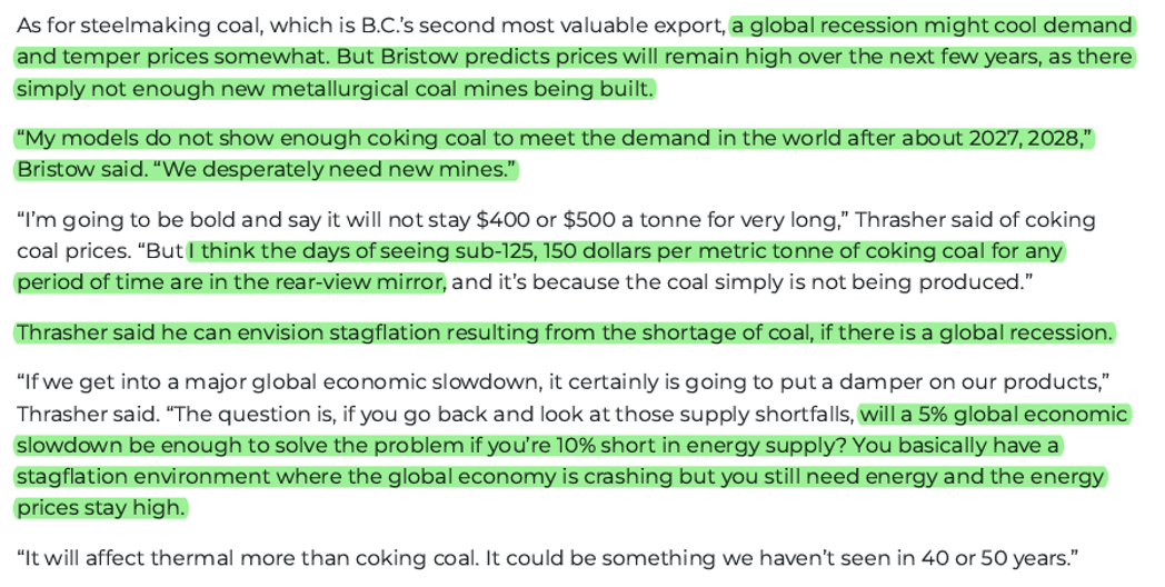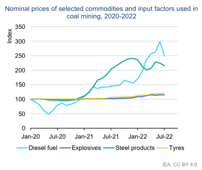Na strani produkcije(ponudbe) le ta pada, saj novi projekti, zaradi ESG politik, niso odobreni in financirani. Firme so podvrževe vse višjim davkom (posledično manj investicij in vzdrževanja, posledično slabša kvaliteta premoga). Delovna sila je težje zagotovljena, prihaja do štrajkov, gorivo in material ter oprema za izkop se draži. Dogajajo se tudi naravne nesreče (požari, poplave, potresi, ...). Vse to dviga ceno premogu in uničuje konkurenco - trenutno obstoječi ponudniki imajo večjo pogajalsko moč.