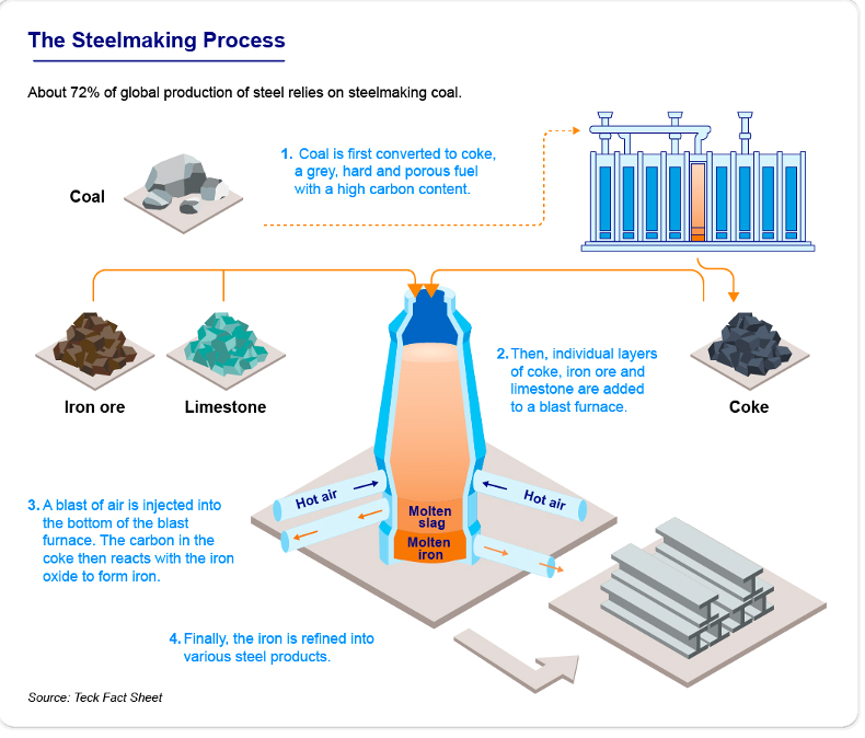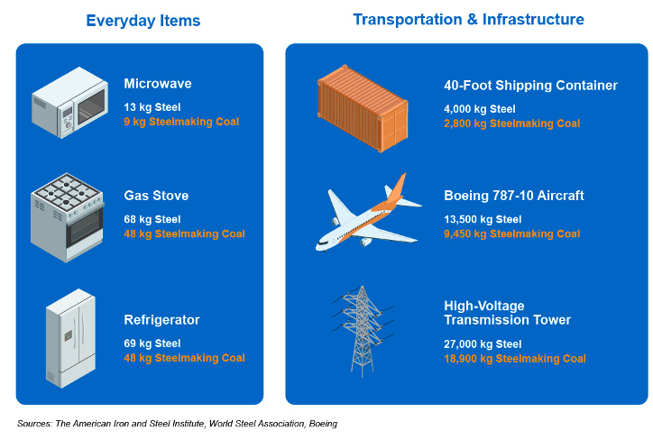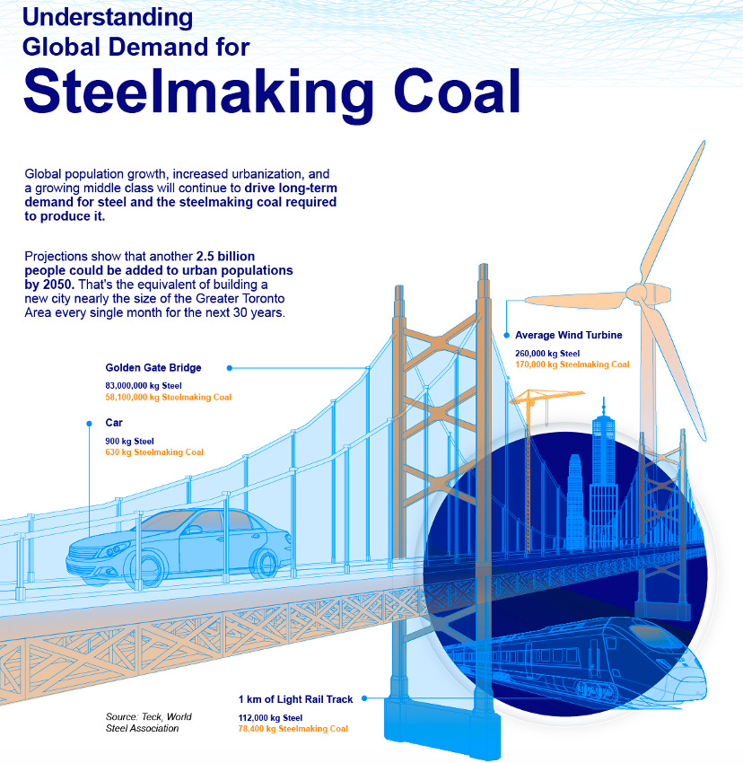 Metalurški premog (črni - ima drugo sestavo ogljika, fosforja, žvepla, vlage, itd.), ki se ga s pirolizo v kotlu segreje na 1100*C in nastanejo grudice imenovane koks, oziroma po ang. coking coal, "coke". Tako imenovan koks je temelj moderne družbe. Z njim delamo: