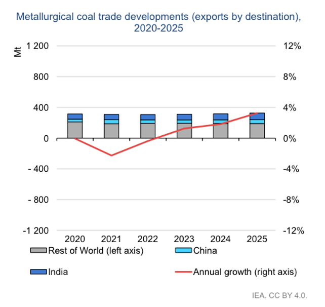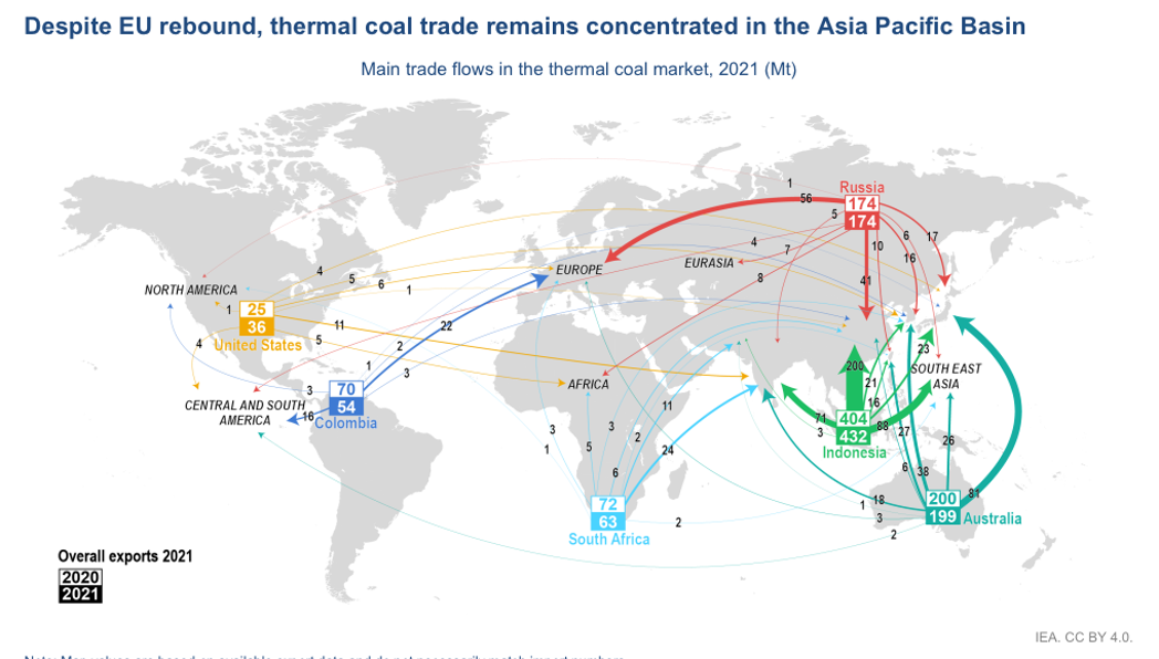 Na strani povpraševanja pa je le to veliko v smislu metalurškega premoga tako za razvite trge na podlagi investicij v zeleni prehod in za razvijajočese trge na podlagi povpraševanja po jeklu za izgradnjo infrastrukture. Termalni premog je primarna izbira razvijajočihse trgov kot odgovor na rast populacije (Azija, Afrika, deli Južne Amerike, ipd.), saj je najcenejši, zanesljiv, dostopen in produktivnostno efektiven. Razviti trgi pa uporabljajo termalni premog, kljub vsem naprezanjem proti, saj ni dovolj plina/infrastrukture, niti "obnovljivih" virov, za tranzicijo. Vlogo igrajo tudi sankcije.