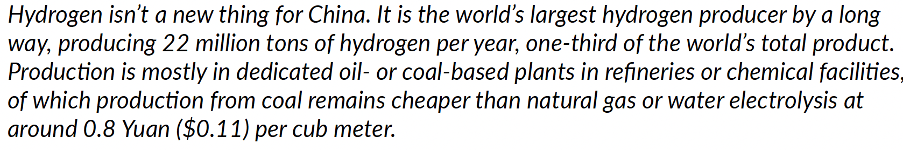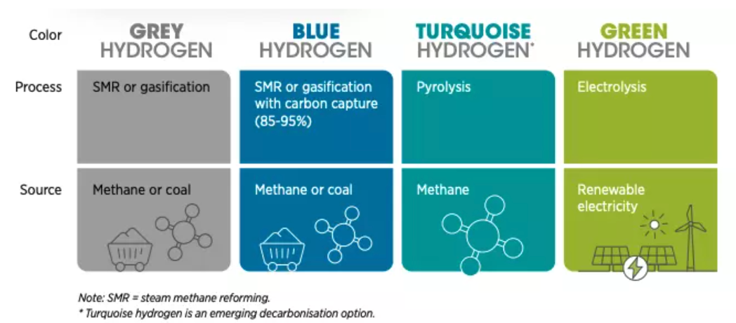 Primarno, kot omenjeno, se pridobiva vodik iz premoga ali plina (grey hydrogen), kar je še slabše za planet, kot direktna uporaba fosilnih goriv in to nekako razumejo tudi green new deal-ovci (recimo). V kolikor se zraven inštalira še CCS (carbon capture storage unit) to imenujejo modri vodik. Tudi v kolikor bi to rešilo problem, je realnost, da nihče ne investira v drag CCS sistem. Sploh ob trenutni neekonomičnosti pridobivanja vodika nasploh, poleg tega pa vsi želijo značko zeleni vodik (filozofija: modri ni dovolj dober - samo za premostitev). Turkizni vodik iz metana s pirolizo je bolj kot ne samo pilotni projekt. Kaj je torej zeleni vodik?