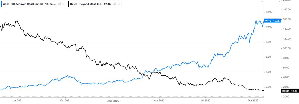 Whitehaven coal ltd (premog v Avstraliji) +750%, Beyond meat inc. -90%