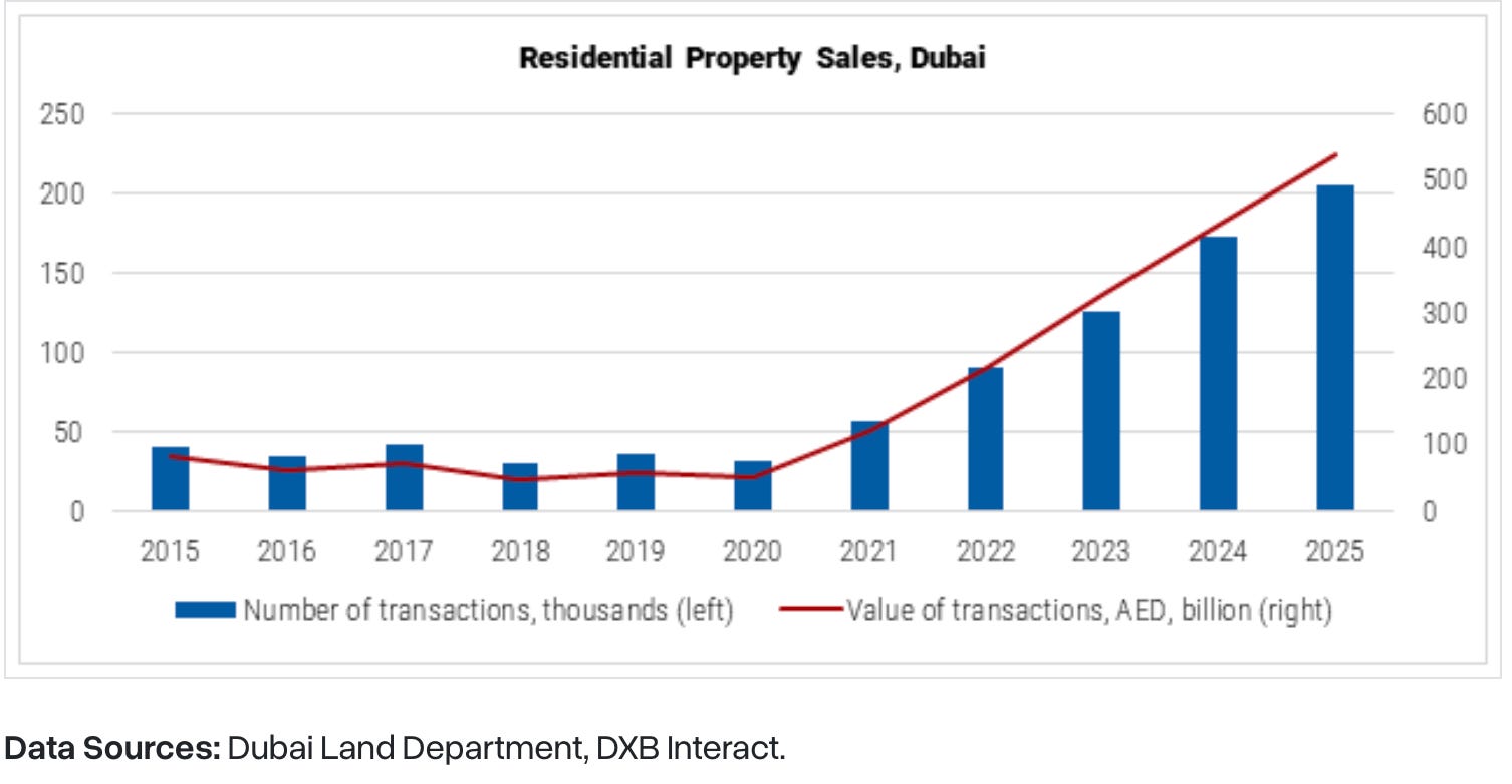 Nepremičnine zadnjih 10 let so imele velik boom. Dubai je bil super diverzifikacija. Ampak seveda se je tekom cikla zgradilo preveč. Posledično je največ studio in enosobnih stanovanj, kar je najceneje ljudem za kupit kot investicijo. Tega je sedaj preveč, cene so/bodo začele stagnirat (ne bodo pa padle). V primanjkljaju pa so še hiše za familije, ki se jih oddaja firmam, ki zaposlujejo tujce, ki pridejo s familjami full time. To je še ok investicija, z dobrim donosom, ampak skoraj nihče se tega ne zaveda, vsi kupujejo stanovanja, ki bodo imela nižje donose v prihodnosti. Hiše kupujejo tudi domačini, katerim se daje vse več kreditov/hipotek, kar je dodaten faktor.