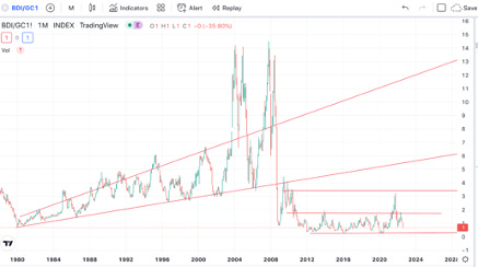 Zgoraj baltic dry index proti zlatu. V depresiji od 2008/2012. Poglej trendno linijo pred tem, 1980-2008.