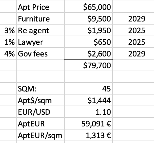 20% downpayment in potem cca samo 1% mesečno, z večjim delom plačila (40%) na koncu (januar 2029). Gradbinec tako dobi svojo maržo šele na koncu - ima iniciativo, da dokonča in teh 34k$ bo čez 4 leta veliko manj vrednih. Gradbinec je velika korporacija iz Taivana (kar je dobro) in ima za sabo sedem projektov v Kambodži. Ko sem naredil downpayment je bil evro že bolj močan proti usd, tako da sem dobil še dodaten popust preko tega. Če stanovanje ne bi bilo tako visoko bi plačal 60k$, torej 5k$ manj.