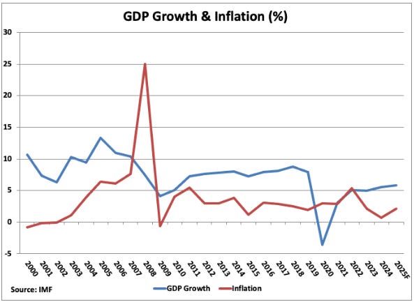 V 2023 in 2024 je bila rast +5%. Povprečje 2011-2019 pa +7% letno. Tudi v 2025 in do 2030 pričakovano povprečno +5% letna rast. - IMF, ADB, AMRO