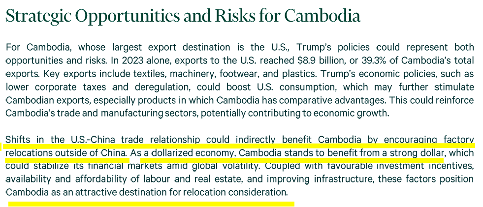 Kambodža je v zanimivi situaciji, kjer profitirajo ne glede na dolar rate: če je dolar močan imajo večjo kupno moč in zaradi tega več/ceneje uvažajo stvari. Če je dolar šibak pa so pri izvozu bolj konkurenčni. Čudno rečeno, ampak Kambodža ima to, kar si Trump želi imeti doma: močno industrijsko bazo na dolarju.