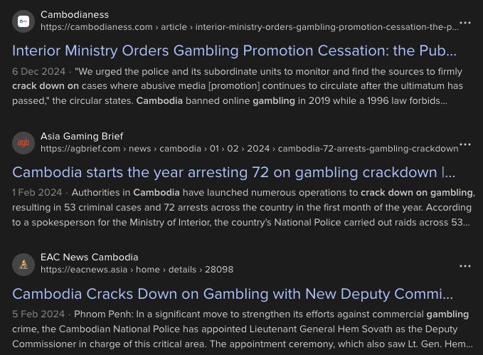 Kambodža, predvsem njena obmejna mesta, pa so bila polna kazinojev in gambling industrija je bila izjemno razvita, skupaj z drogami in kurbami, predvsem za Kitajce. Zadnjih +5 let pa vlada v različnih fazah poskuša prepovedati in razbiti gambling industrijo...