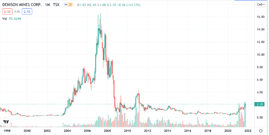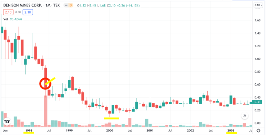 Leta 1998 je ugotovil, da je generalni market takratnih “internet” delnic precenjen. Istočasno je zavohal priložnost na marketu urana. Naredil je research in vložil v kanadskega proizvajalca Denison Mines. Vstop je imel na cca 0.6 CAD, označeno na grafu spodaj: