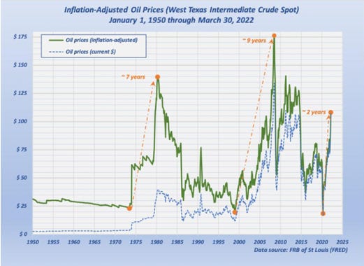 Poglejte si oil priced in gold, oil as % of US balance sheet ali oil price inflation adjusted. Zgrozili se boste, da zgodovinsko gledano cena sploh še ni na zgornjih mejah, medtem ko naj bi bili že v hudi energetski krizi.