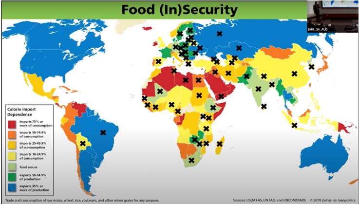 Spodaj prikaz prehrambeno samozadostnih držav. Še posebno bodite pozorni na križce. Vse države s križcem dobivajo velik/pomemben del gnojil iz Rusije.