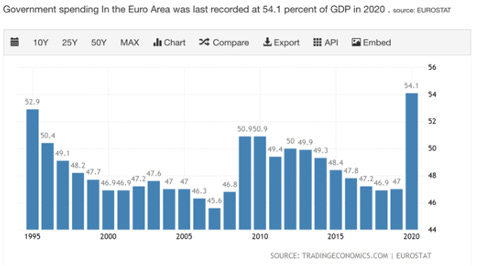 55% se vam mogoče ne zdi veliko, ampak za opomnik... 100% = komunizem. Poleg tega nisem prepričan, da bo ta številka v prihajajočem desetletju upadala nazaj proti 45%, kot v preteklosti. Build back better, green new deal in nešteto drugih stvari, ki jih sploh ne bom omenjal, skupaj s politično željo po zapravljanju denarja mi govori, da vlada ne bo trošila manj, ampak več.