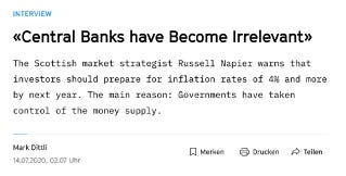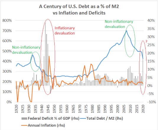 Torej Lyn Alden verjame, da se situacija iz 1940ih ponavlja, ker so tako vpliv C19 na gospodarstvo in odziv politike ter določeni makro-ekonomski indikatorji enaki, kot takrat. Tole je njen članek, če se kdo želi poglabljati dalje: https://www.lynalden.com/fiscal-and-monetary-policy/