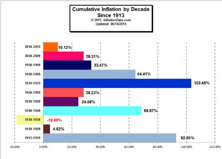 Tukaj ne govorimo o hiper-inflaciji, ampak občasnih povečanih inflacijskih vrhovih, ki preko desetletja povprečno dvignejo % inflacije.