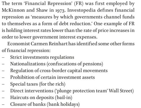 "Financial repression is not a conspiracy theory, it is rather a collective set of macroprudential policies focused on controlling and reducing excessive government debt through 4 pillars – negative real interest rates, inflation, ring-fencing regulations and obfuscation – to effectively transfer purchasing power from private savings." - Tim Price