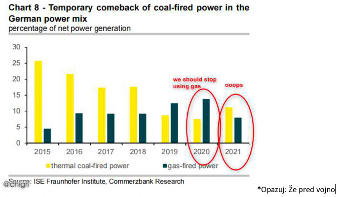 napad na energetski sektor (nuklearna je že dolgo nepopularna, zato čisto podhranjen sektor; oil fracking, ki je bil zadnja leta svetovni pogon, se ga vse bolj stiska zaradi vpliva na okolje; plin zelo centraliziran in poslednično drag ter 30% se ga pridobi kot by-product oil frackinga; ostane nam samo hidro/vetrna in solarna energija, ki so trenutno 7-9% celote in so tudi v idealnih pogojih delovanja (dovolj vode, dovolj sonca in vetra, ne premrzlo ozračje) prešibke. Premog osovražen do te mere, da ga na zahodu želijo praktično iztrebit kar čez noč (čeprav ne ratuje):