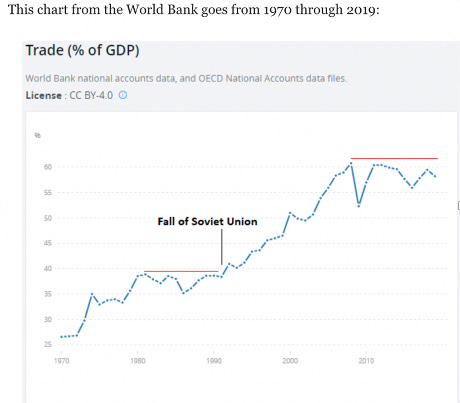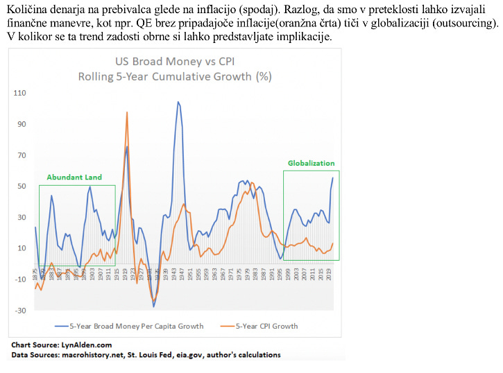 Le to se da izmerit in spodaj vidite, da se svet počasi nazaj deglobalizira. Dosegli smo vrh in nekaj časa tam stagnirali, z vojno v Ukrajini pa bomo prešli v deglobalizacijo. Svet prepolovljen na dva ali več polov in posledično potrebnih več nabavnih verig recimo. Just in time bo zamenjan z Just in case. To je seveda samo eden izmed inflacijskih dejavnikov, ki so se spremenili.