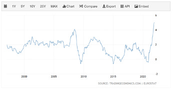 (opomnik, to je pisano konec 2021) Zgornji graf je izpred pol leta. Če pogledamo trenutno situacijo inflacije spodaj, smo imeli 5% vrh, ki se bo verjetno nadaljeval (moje mnenje-2022), preden se obrne navzdol in potem spet v naslednjih 10. letih še nekaj takih vrhuncev.