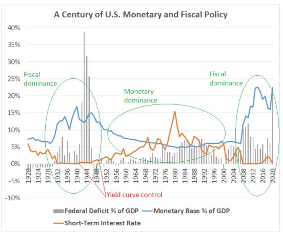 Zaradi tega se monetarna politika (bančni vzvodi) postavi v ozadje v smislu spodbujanja gospodarstva in preide v ospredje fiskalna politika (državni stimulusi, olajšave, subvencije, projekti, ...). Obkroženo na zgornjem grafu - fiscal dominance.