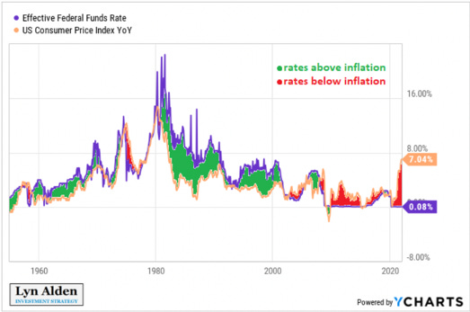 Tole je prikaz, kako se drži obrestno mero nizko (modro), medtem ko inflacija volatilno niha (oranžno).