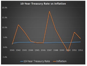 V 1940 in dalje pa je sledilo inflacijsko zmanjšanje, kot opisano malo prej. Če gledamo oražno črto (% inflacije) med 1938 in 1950 ima tri visoke nihaje na 12%, 19% in 8%, ki trajajo po cca 2 leti. Še enkrat, to omogoči odplačevanje dolga v manj vredni valuti.