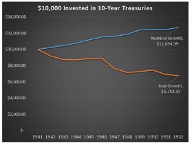 Tole je primer, če si vložil 10k v 10 letno obveznico 1940. Nominalno si po 10. letih dobil nazaj več denarja (12.694eur), ampak realno je bila kupna moč tega dosti manjša (6.754eur), zaradi devalvirane valute: