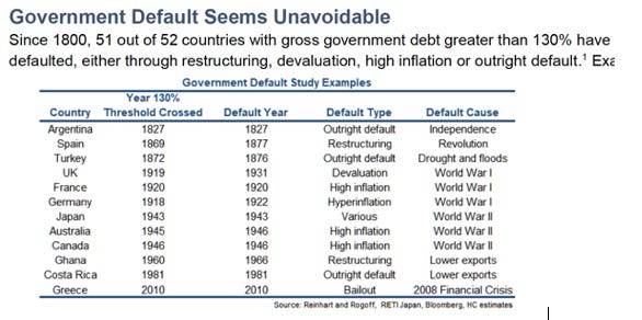 Narejena je bila študija (Hirschmann Capital letters), kjer je prikazano, da države, ki dosežejo nad 130% BDP zapadejo v bankrot, praktično 100% časa (Izjema Japonska, za enkrat):