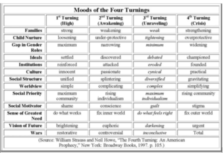 Povzeto po The Fourth Turning (N. Howe & W. Strauss, 1997).
