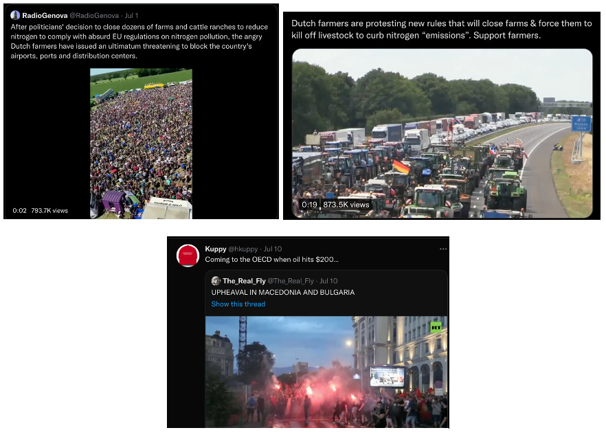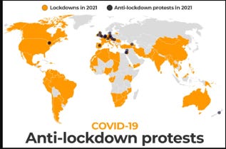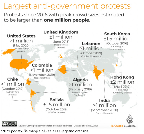 Proteste smo imeli že 2008 ter kasneje, npr. occupy wallstreet 2011, arab spring 2013, pro/anti-Trump 2017, itd. Zares pa so se razširili v 2020. Proti vladi, proti PCT pogojem, proti odprtju novih fabrik fosilnih goriv, BLM/antifa, ... začeli so se tudi štrajki ljudi za višje plače, ipd.