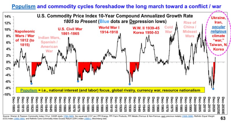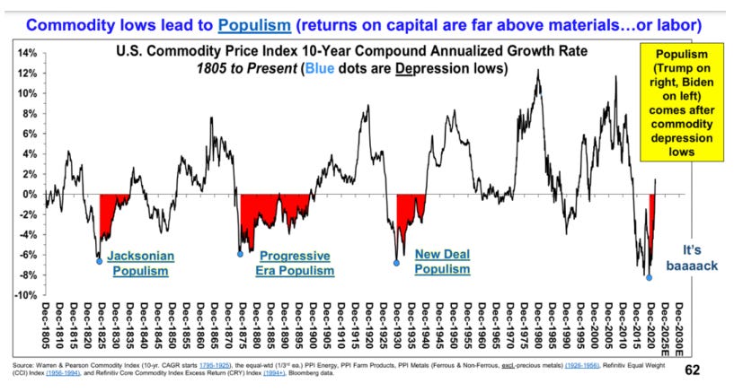 Spodaj trije grafi, povezava nazaj na cikel surovin. Vsakič, ko so surovine na dnu in naredijo hiter preobrat, trpi srednji/nižji sloj, kar ustvari trenja, saj v tistem trenutku po navadi tudi donos od kapitala prekaša donos od dela. Manjko surovin ustvari tudi trenja med državami, kar lahko vodi v vojno.