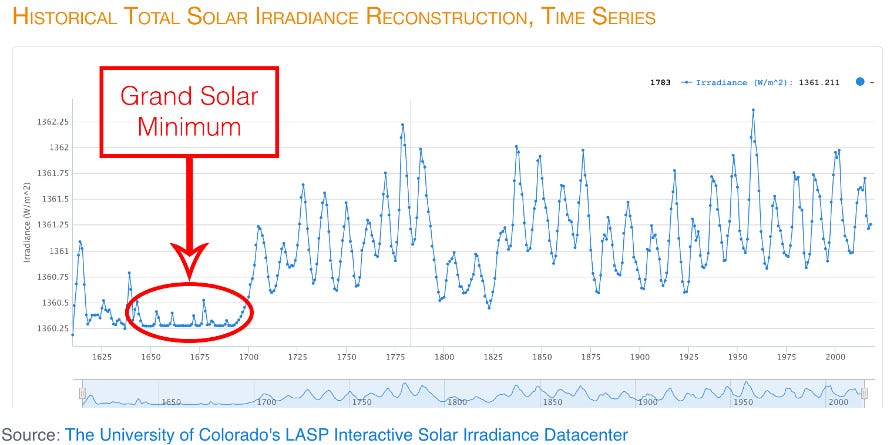 "Historically, grand solar minimums have been associated with extreme weather events. Floods, droughts, heavy snowfall, late springs, and early autumns have all resulted in famine. Famine during GSMs has led to starvation and societal upheaval."