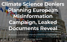 "A coalition of climate science denial groups is gearing up for a European media blitz later this month, in an apparent bid to derail efforts to set an EU-wide “net zero” emissions target.