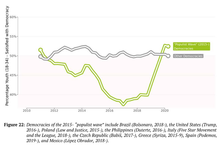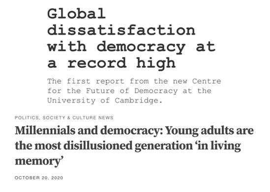 Glej spodaj report: https://www.cam.ac.uk/system/files/youth_and_satisfaction_with_democracy.pdf - Youth and satisfaction with democracy 2020 Cambridge in http://www.equality-of-opportunity.org/papers/abs_mobility_paper.pdf