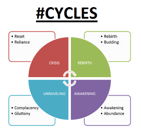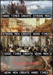 Težki časi naredijo močne ljudi. Močni ljudje naredijo dobre čase. Dobri časi naredijo šibke ljudi. In šibki ljudje naredijo/omogočijo težke čase. Cikel se ponavlja skozi zgodovino.