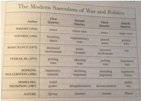 V Evropi se vsi cikli od krize do krize odvijejo v 80-105 letih, z izjemo enega, ki je trajal samo 50 let. O tem ne govori samo knjiga The 4th turning, ampak mnogo drugih (Quincy Wright v Study of war, A. Toynbee v Study of history, L.L.Ferrar, R. Rosecraance, L. Dehio, W. Thompson & G. Modelski, J. Goldstein).