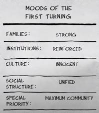 Po obdobju krize (post WWII) sledi Prvo obdobje cikla (spomlad). To je obdobje obnovitve. Inštitucije so močne, saj so bile med krizo na novo postavljene/zasnovane. Iz tega razloga jih ljudje priznavajo in družba je na podobnih/enakih tirnicah, ko gradi novi svet. Individualizem je zaradi krize pred kratkim šibak.