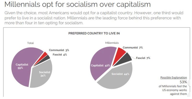 Vse zgoraj našteto je razlog, da 50% ljudi verjame v socializem kot rešitev in sovraži kapitalizem, saj jim ni nič dal, medtem ko imajo socializem v dobrem spominu.