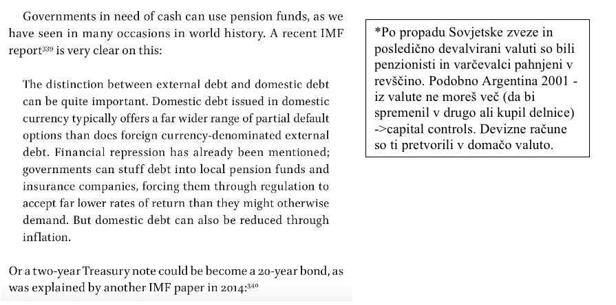 Toliko na strani posameznika. Na državnem nivoju so oškodovane države, ki so dajalke kreditov tistim, ki prakticirajo financial repression (inflacijski delevaraging). Za ZDA so to recimo Arabija, Japonska in Kitajska (ki že od 2013 počasi niža posojila in jih daje afriškim državam). Na gospodarskem nivoju imajo v grobem problem vsi, ki so po zakonu primorani držati državne obveznice (banke, zavarovalnice, pokojninski skladi, varčevalni skladi, ...) ali jim država regulira cene (javne storitve/energetika/...) in posledično preko pokojnin, plač, varčevalnih računov tudi navaden človek.