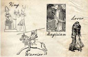 Vojak je tisti, ki prispeva disciplino, pogum, zvestobo in samozaupanje. Naravno športen tip postave je tipičen za ta karakter (ni pa pravilo seveda). Čarovnik je tisti, ki prispeva znanje, modrost, izkušnje, ... Naravno suhljat tip telesa je značilen za ta karakter (še enkrat, ni pravilo). Kralj je tisti, ki primarno prispeva k združevanju, organizaciji in viziji. Karakter se lahko prepozna npr. po podjetnosti in podobnih veščinah. Ljubimec je mogoče najbolj podcenjen karakter v času krize, saj je bolj umetniški tip, vendar vseeno nepogrešljiv. Ustvarja dobro energijo v skupnosti, ko jo primanjkuje, pomaga pri graditvi novih odnosov in zaupanja v skupini, prispeva drugačno, kreativno perspektivo, ... Kralj in čarovnik živita primarno v prihodnosti. Vojak in umetnik primarno v sedanjosti. Knjiga je bila sicer napisana za moški del populacije, ampak verjamem, da seveda velja enako tudi za ženske.