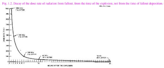 Na zgornji sliki vidimo izpostavljenost radiaciji (gama/X ray) po eksploziji. Roentgen (R) je enota za merjenje izpostavljenosti, ki bi bila eno uro po eksploziji 1000 R/hr. Že 48 ur po eksploziji bi se to zmanjšalo na 10 R/hr. V realnosti bi bil zrak v tistem okolju dovolj varen po dveh tednih od eksplozije.