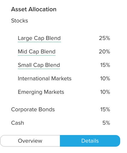 $50,0000 - 25% delnice/surovine (inflacija/višji življenski stroški, rast) - cilje je vsaj +15% donos in dobra rast tega dela portfelja