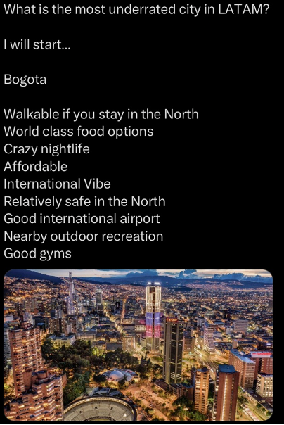 Realno nima smisla nakup stanovanja v Bogoti kot investicija, ker so donosi na oddajanje slabi. Lahko pa pride zelo prav nekomu, ki non-stop potuje med EU in LatAm ter preživi nekaj časa v Kolumbiji.