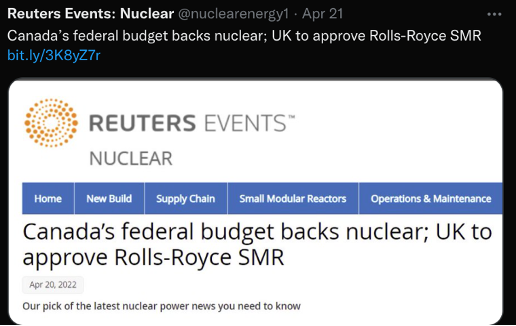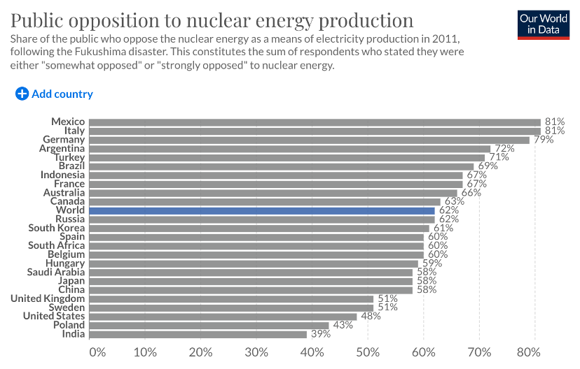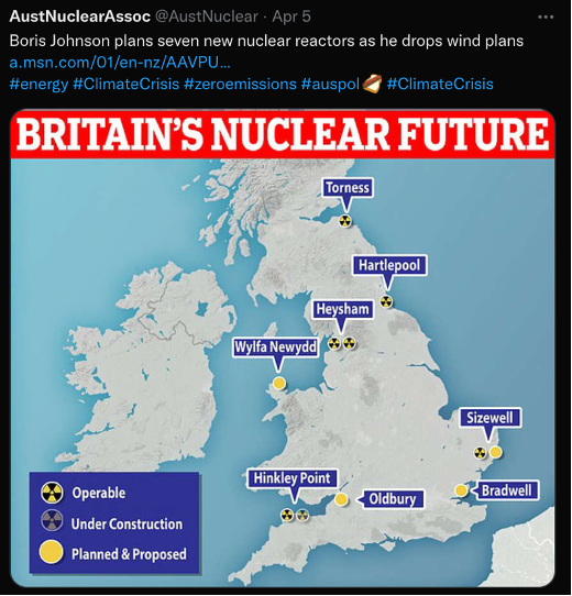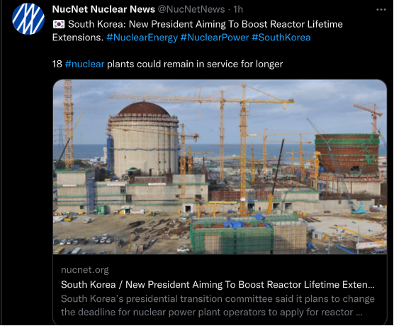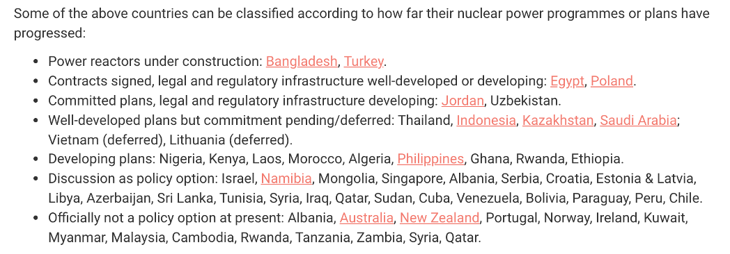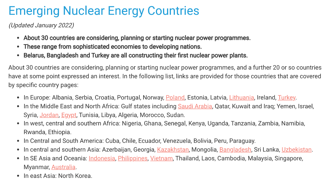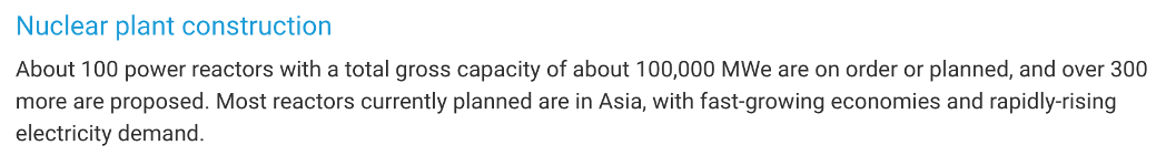 Skoraj ne najdeš države, ki ne govori o gradnji novih reaktorjev: UK, Južna Korea, Japonska reštart, Kitajska, US, Argentina, Indija, Turčija, Kanada, Rusija, Afrika, Poljska, Bližnji vzhod, ... tudi Francija bo obnavljala stare reaktorje in celo Nemčija je prestavila zaprtje tistih zadnjih. Konec koncev imamo tudi v Sloveniji pogovore o drugem bloku.