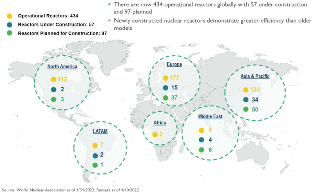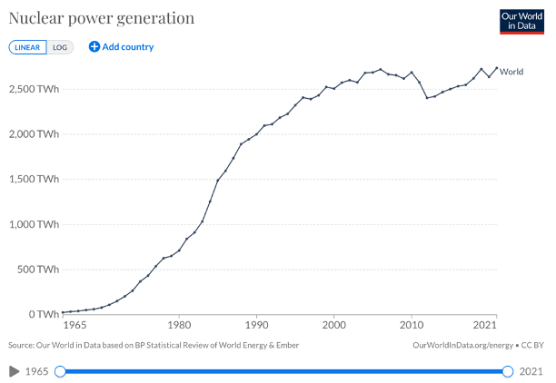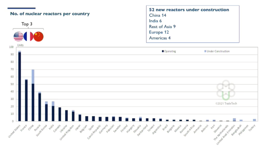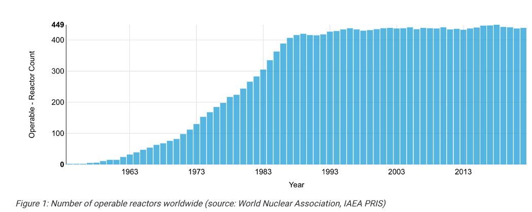 Preko let je število reaktorjev globalo ostajalo približno enako, ker so nekatere države zapirale, druge pa gradile nove (Japonska je post Fukušima zaprla 54 rektorjev recimo):