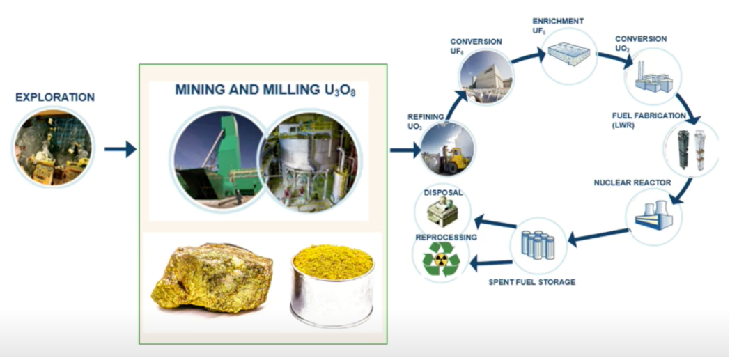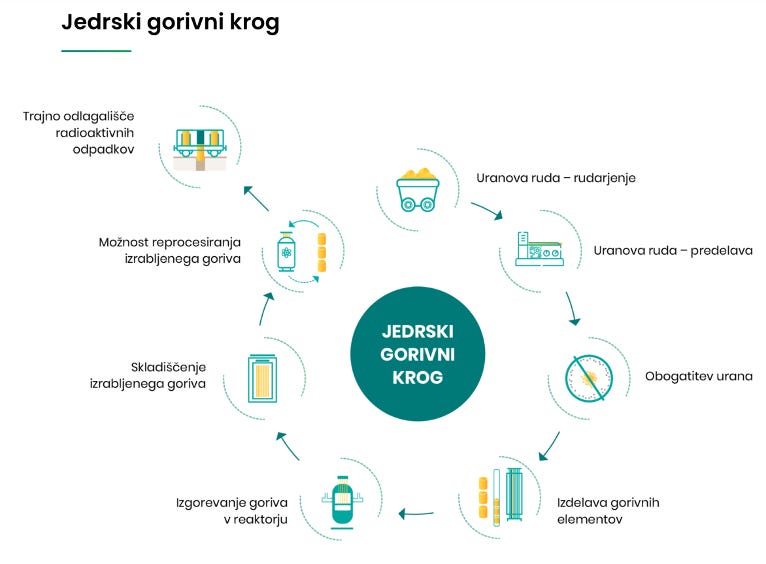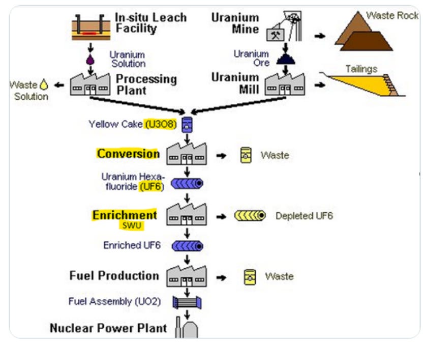 Izkop (U3O8) -> konverzija v plin (UF6) -> obogatitev (iz 0.7% na 3.5% U235) -> konverzija v haribo tabletko (UO2) -> gorivne palice (celoten krog traja cca 2 leti)