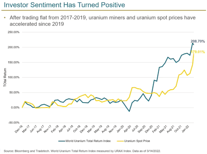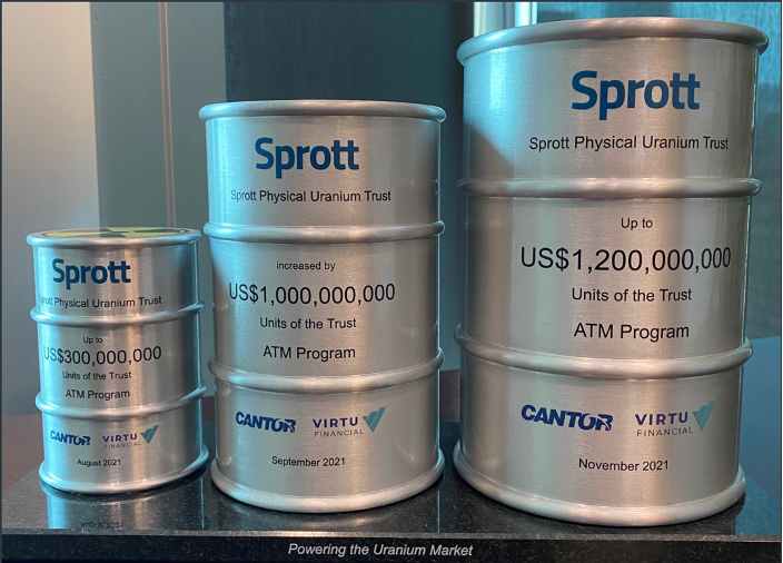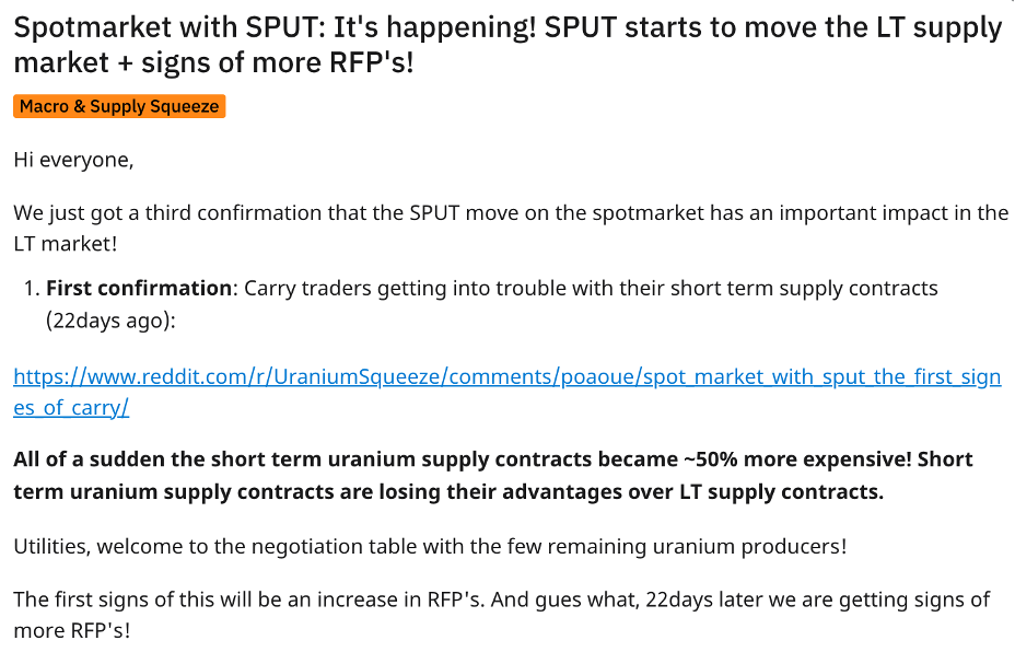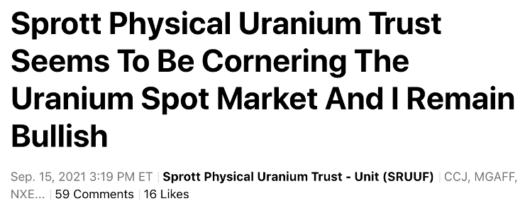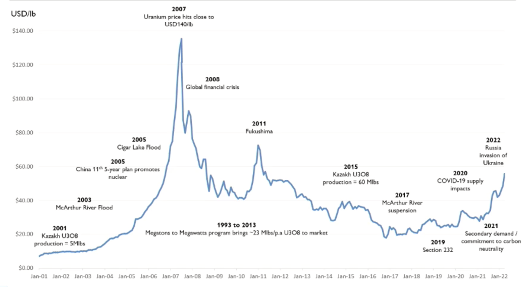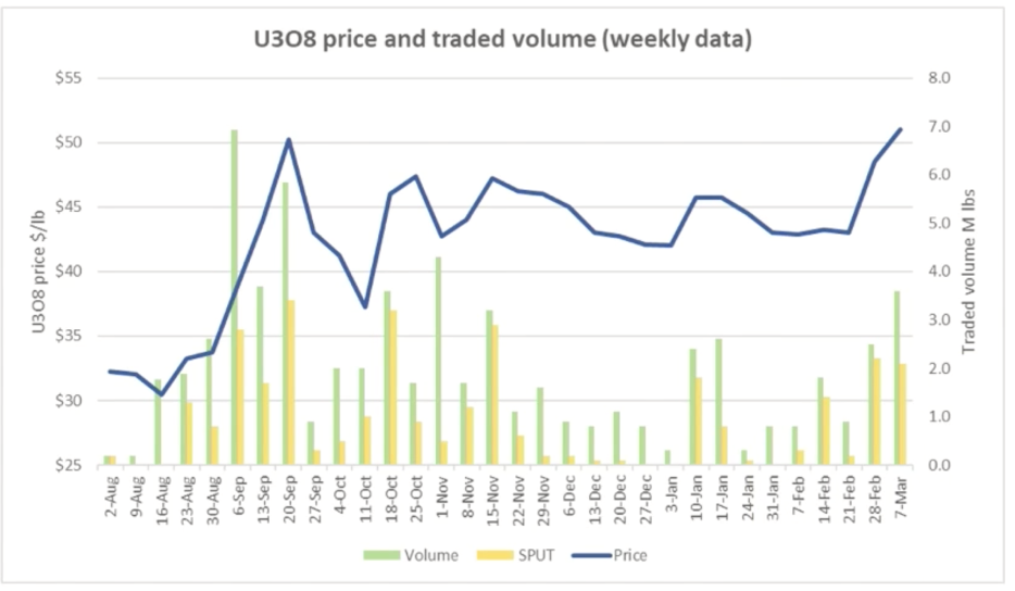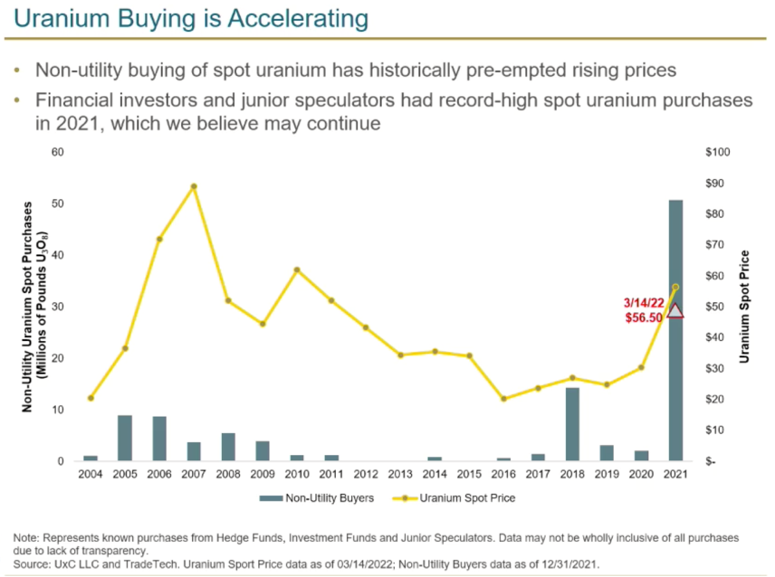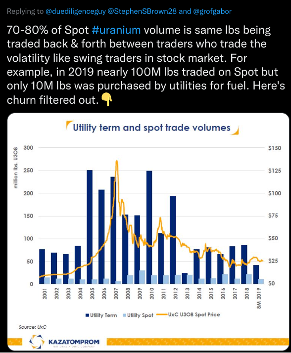 Med leti 2016-2020 je bila cena urana tako nizka (cca 20$), da so na trg vstopile različne finančne inštitucije (kot npr. sprott physical uranium trust-SPUT), ki so rekle: "fuck it, če ne boste vi kupovali urana po tej debilno nizki ceni, ko ga dejansko rabite, ga bomo pa mi pokupli, skladiščili in prodali za več v prihodnosti".