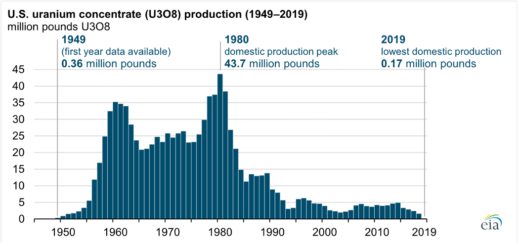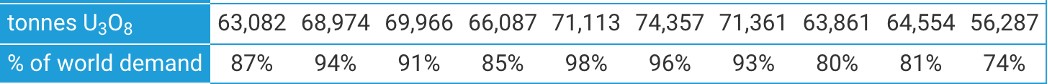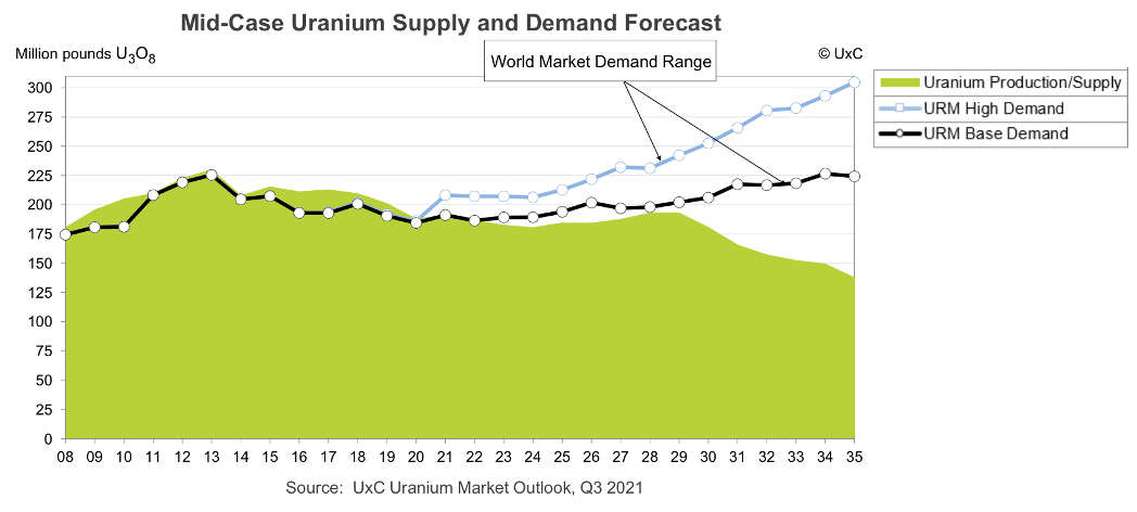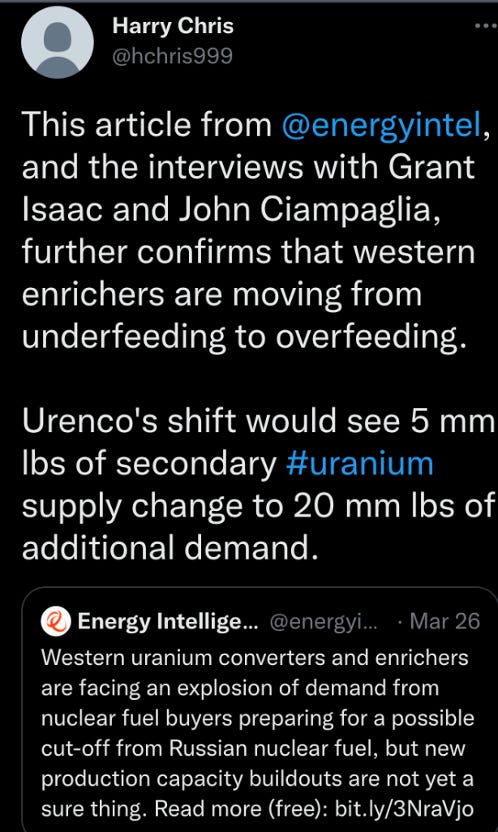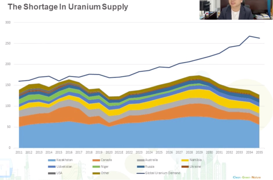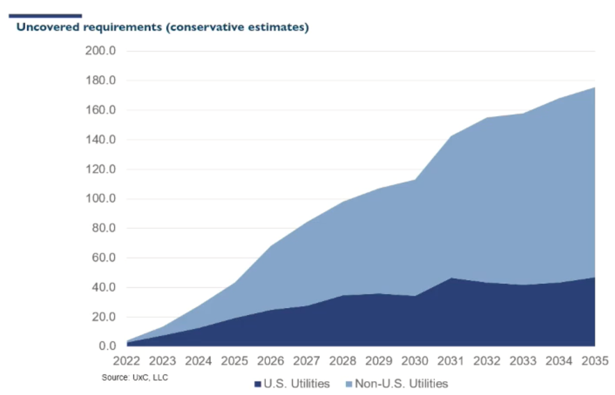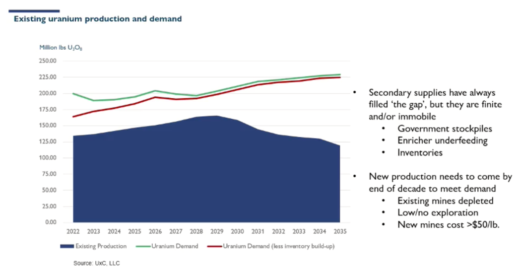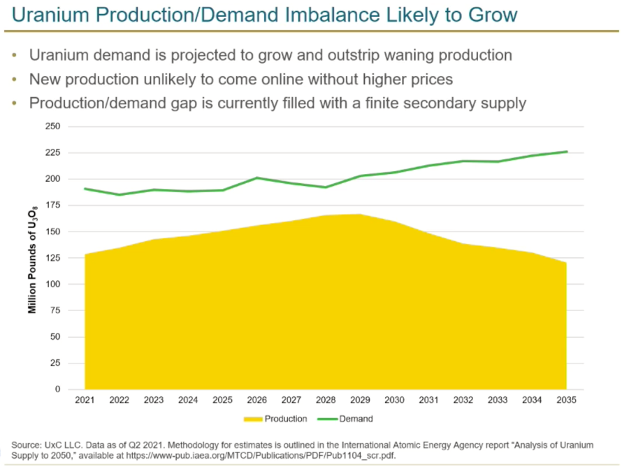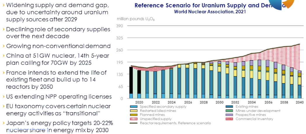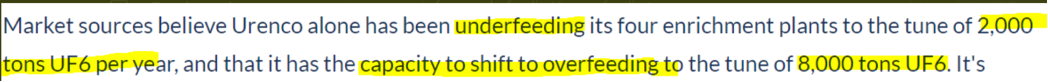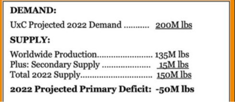 Trenutno se letno (samo za obstoječe nuklearke) porabi cca 185-200 miljonov lbs. Proizvede se 125M lbs (številka iz slike se je zmanjšala zaradi covida). Sekundarni supply je bil cca 15M lbs letno (underfeeding). Skupno vsaj 50 miljonov poundov letnega primanjkljaja. To se dogaja že od 2012.