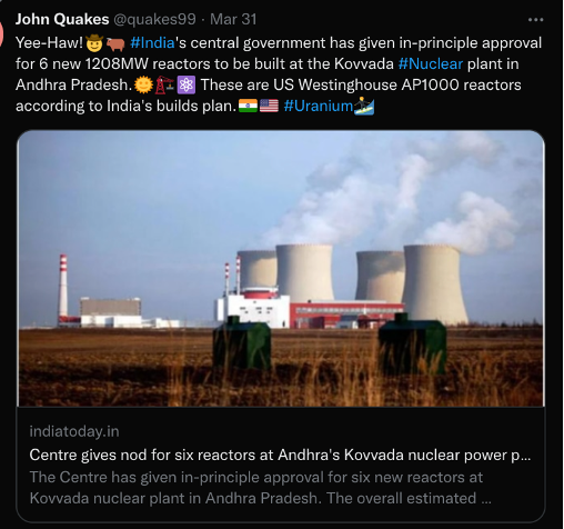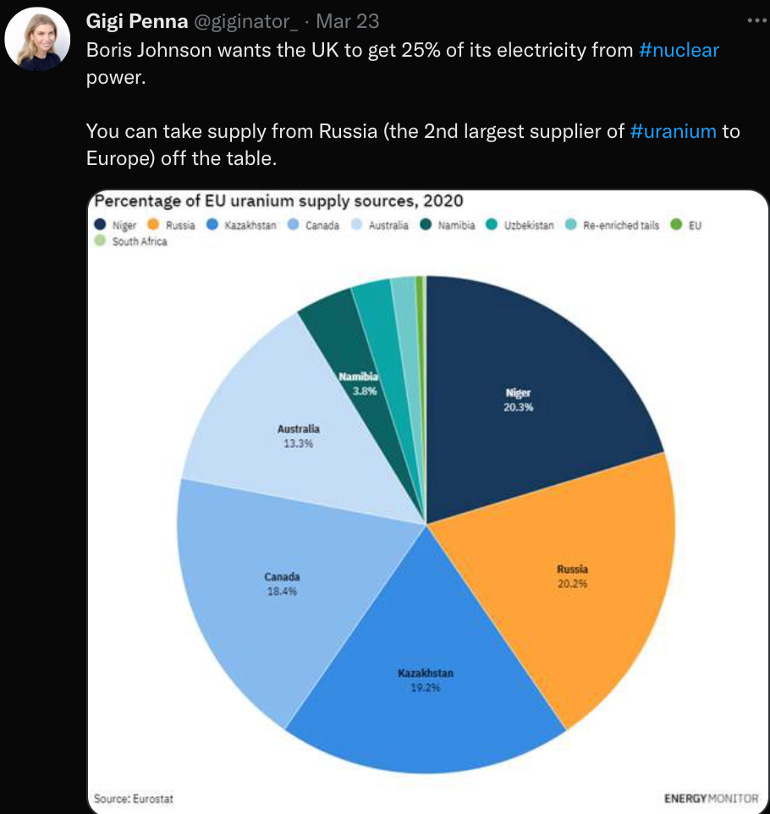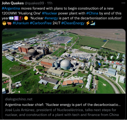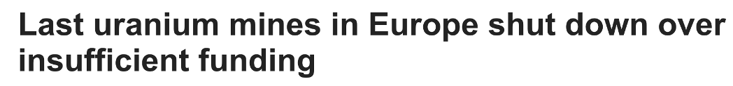 Večkrat sem že govoril o Kitajski, ki želi zgraditi 150 novih reaktorjev v naslednjih 15. letih. Pomislite naslednje: vsak zgrajen reaktor potrebuje za 3 leta goriva, preden zaštarta. To je 1.5M urana * 150 = 225M - več kot trenutna letna proizvodnja! Kaj se zgodi, ko gre kitajc v Kazatomprom in reče "ob naslednjem izteku pogodbe, prodaj meni tistih 50% produkcije, ki jo normalno prodajaš na zahod, ti dam boljšo ceno" .